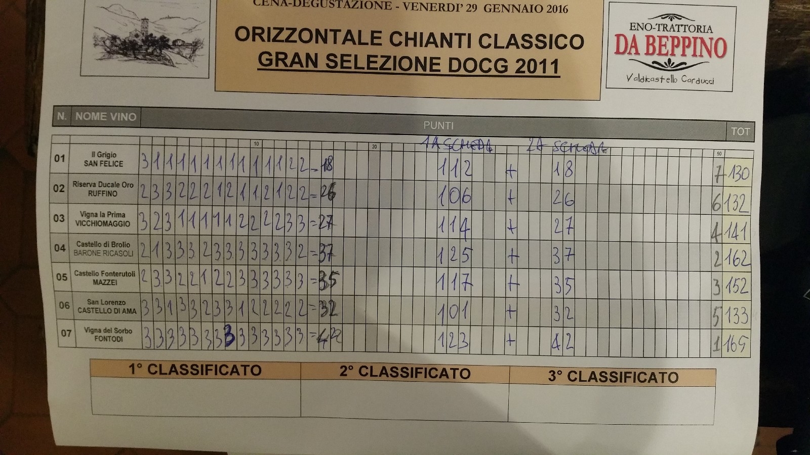 Risultato della degustazione "Orizzontale" alla cieca di venerdì scorso 29 gennaio 2015... il vincitore della serata è stato (e non è una novità), con 165 punti, VIGNA DEL SORBO GRAN SELEZIONE 2011 da sole uve sangiovese. Un vino con una marcia in più degli altri, seppur ottimi, vini che forse aveva il “difetto” di essere ancora giovane per la complessità e la potenza che, già dal colore, si poteva intravedere e che sicuramente lo porteranno a essere un vino di eccellenza assoluta nei prossimi anni. Panzano si dimostra, ancora una volta, a mio parere e tanto più al fianco dell'enologo Franco Bernabei, la zona più vocata per i grandi sangiovese. Secondo classificato è stato, a soli 3 punti di distanza, un elegante, equilibrato, rotondo e imponente CASTELLO DI BROLIO, pura sinfonia, magistralmente diretta dall'enologo Carlo Ferrini che, forse più di chiunque altro, ha nel sangue la Toscana e il suo territorio e ama smussare la ruvidità del sangiovese con piccole aggiunte di cabernet e merlot... In terza posizione con 152 punti si piazza CASTELLO DI FONTERUTOLI, anche questo (guarda caso) seguito dallo stesso Ferrini, ottima complessità sia all'olfatto sia al palato, forse appena leggermente meno strutturato dei primi... Per il resto tengo a precisare che tutti i vini sono stati veramente di altissimo livello, e solo sentendoli contemporaneamente se ne avvertono le piccole differenza visive, olfattive e gustative che hanno portato alle preferenze evidenziate. Ogni vino si è dimostrato, tuttavia, all'altezza delle aspettative rispondendo nella quasi totalità dei casi alla fascia di prezzo in cui si colloca. A questo proposito è doveroso riconoscere "Castello di Brolio" di Barone Ricasoli il vino Gran Selezione 2011 con il miglior rapporto qualità/prezzo tra quelli degustati. Daniele Lazzerini
