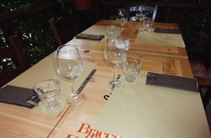 Non c'è il buffet ed i tavoli sono allestiti con le cassette in legno dei vini. Anche l'apparecchiatura è in stile vintage con colori caldi e rilassanti.